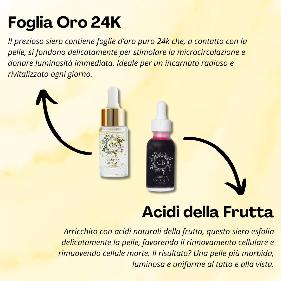 Scopri Oro 24k Serum Formula, un kit che combina il meglio di due prodotti esclusivi: il Siero all’Oro 24K e il Facial Serum. Pensato per chi desidera un trattamento completo e di lusso, questo duo è indispensabile per ottenere risultati visibili e duraturi.